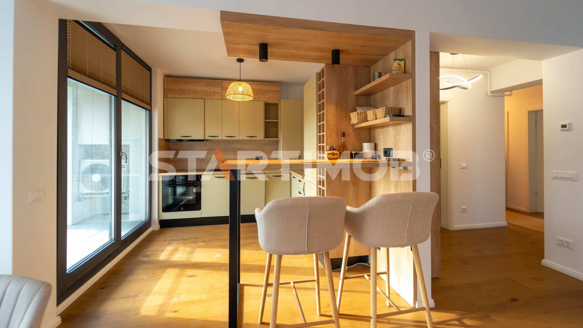 Bucataria este integral dotata iar accentul este pus pe functionalitate, toate electrocasnicele fiind incastrate, cat mai practice si mai la indemana : cuptor electric, hota si plita electrica pe inductie, combina frigorifica si masina de spalat vase marca Electrolux, dispune de toate utilitatile separate, tamplarie din PVC cu geam termopan, parchet, incalzire in pardoseala cu centrala termica proprie Viessmann, TV LCD Samsung in living, stander pentru haine, dulapuri tip dressing, system de aer conditionat Hitachi, etc. .