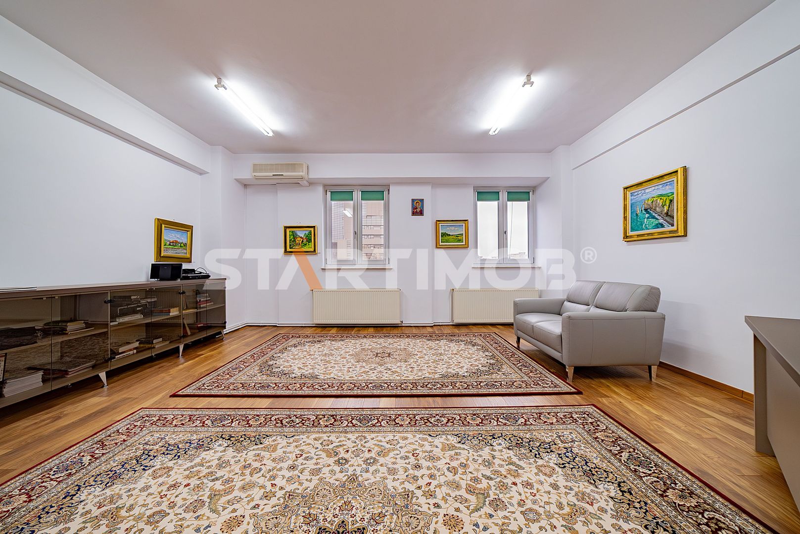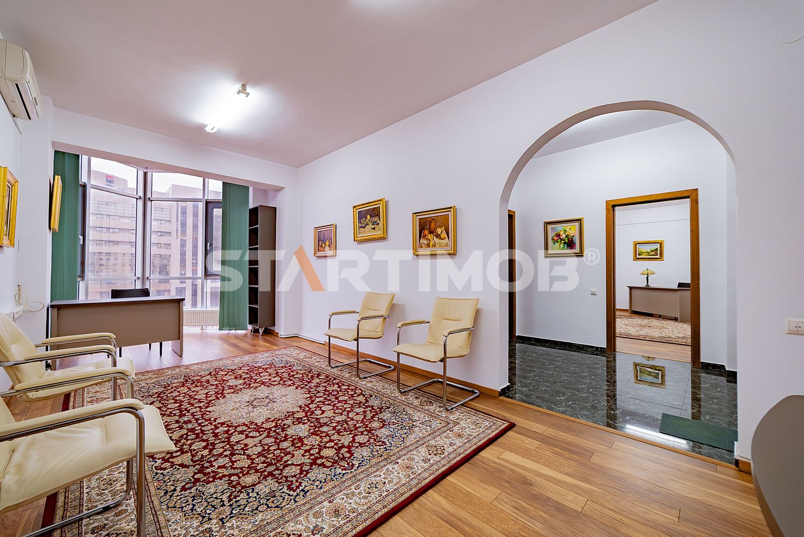 Cabinetul dispune de o suprafata de 105 mp, detine in proprietate si cota de teren aferenta spatiului, beneficiaza de sistem de alarma si supraveghere video, contorizarea este separata la utilitati iar incalzirea se realizeaza cu centrala termica proprie.