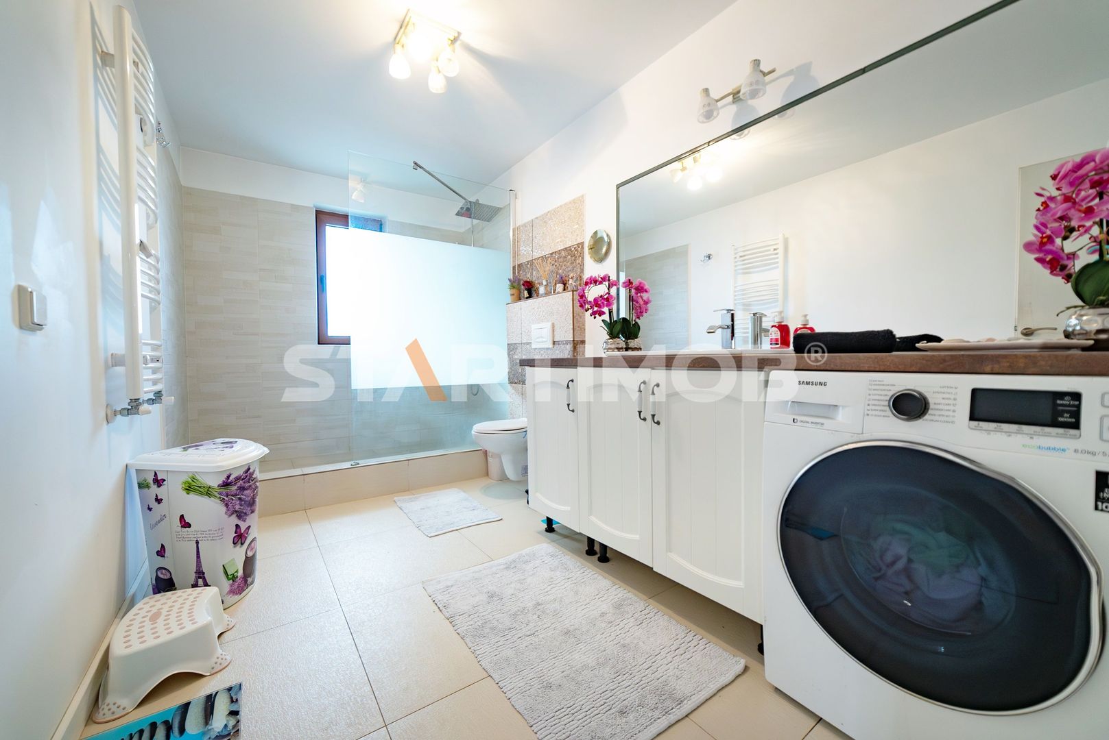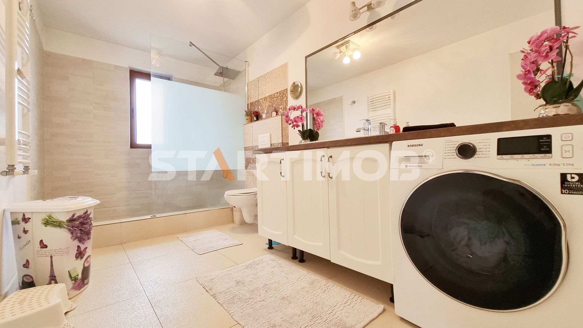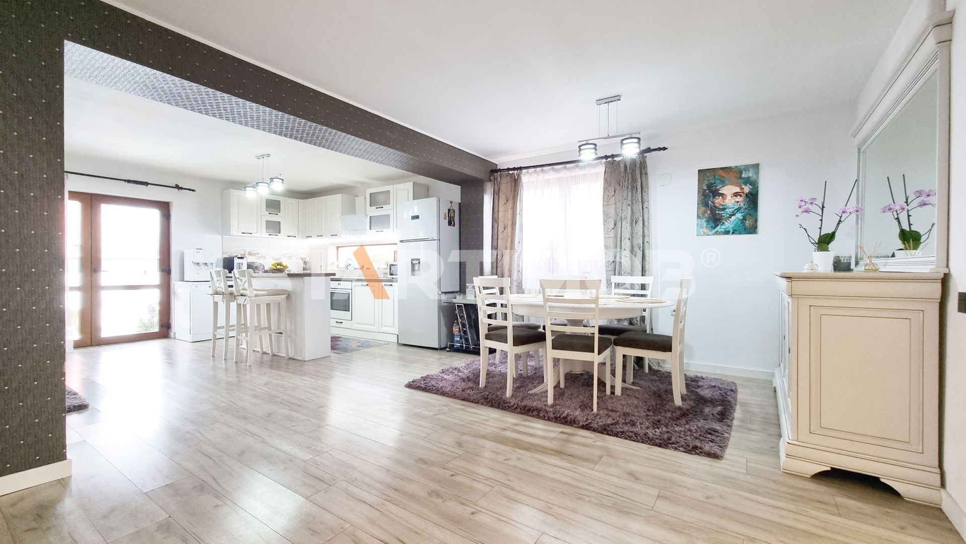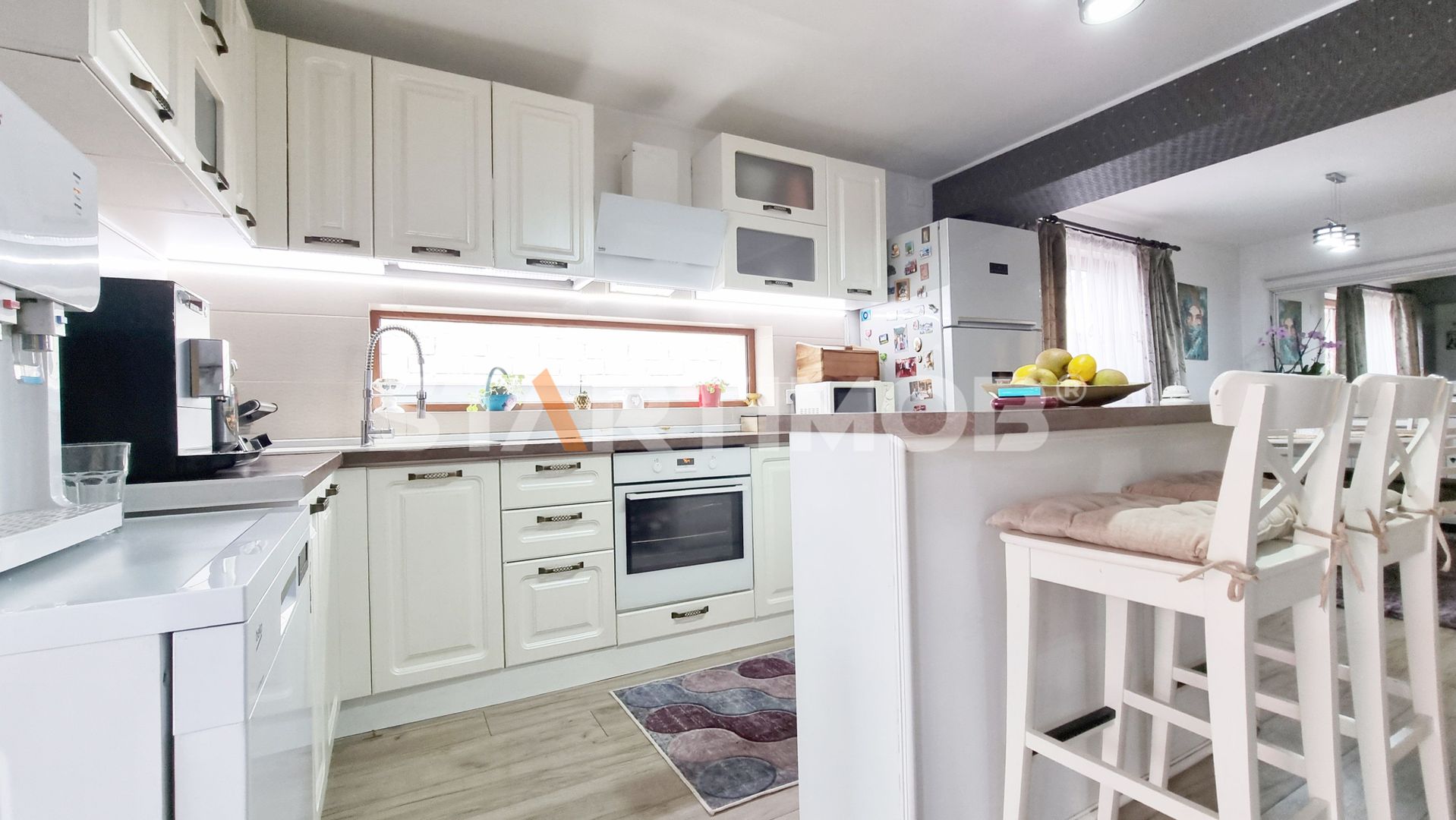 Imobilul se inchiriaza utilat si mobilat complet cu bucataria dotata cu masa tip insula si electrocasnice precum cuptor electric Electrolux, plita pe inductie Gorenje, hota electrica si masina de spalat vase 60 cm marca Beko, combina frigorifica Beko Water Dispenser, masina de spalat automata marca Samsung si TV LCD Smart Samsung in living si dormitoare, filtru de apa, system de alarma, etc