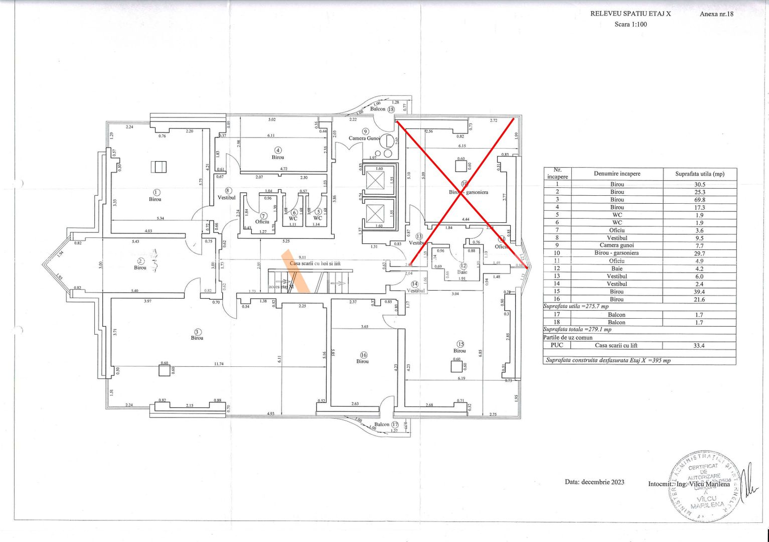 Spațiul se afla la etajul 10/11 are o suprafața totala de 312.5 mp si o arie utila de 260.59 mp si este compus din șase birouri cu suprafete de 69,8 mp, 30,5 mp, 25,1 mp, 17,3 mp, 39,4 mp si 21,6 mp, 2 grupuri sanitare, oficiu tip kitchineta, vestibul si 2 balcoane de 1,7 mp .